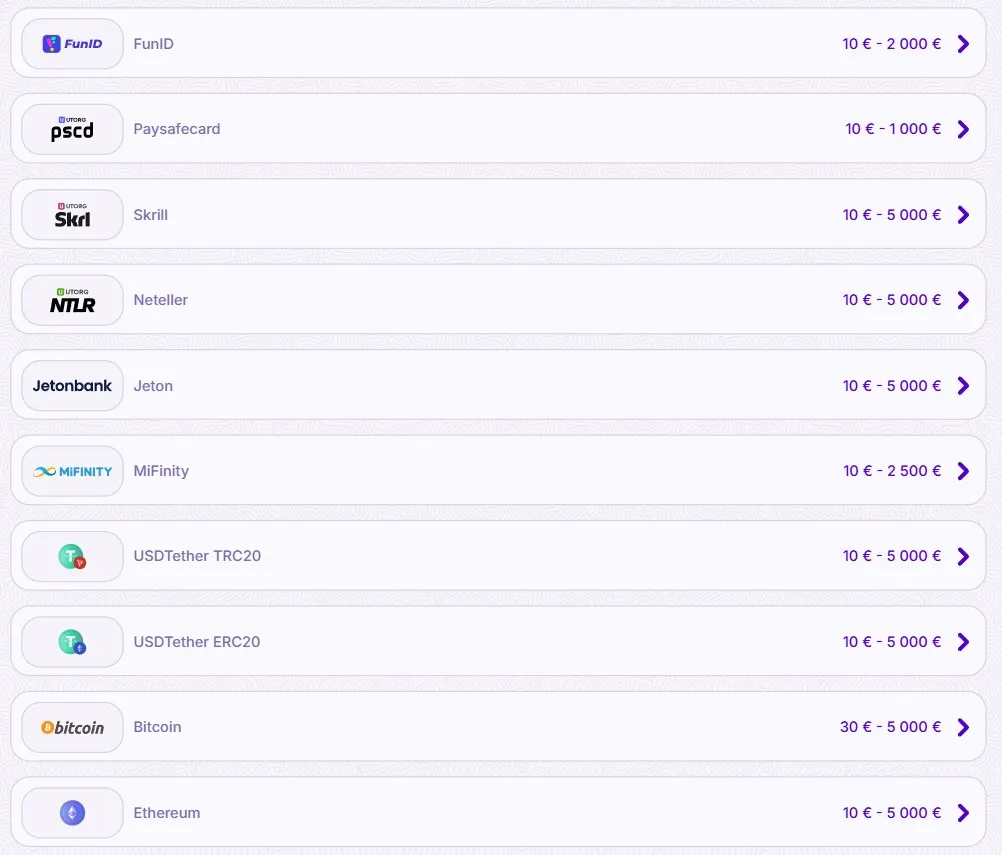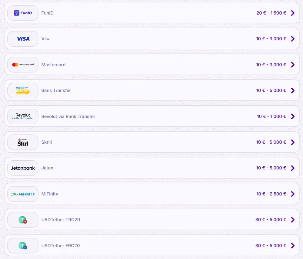 Fiat : EUR, USD Crypto : Bitcoin, Litecoin, Ethereum, Tether, Cardano, BitcoinCash, Ripple, Doge |